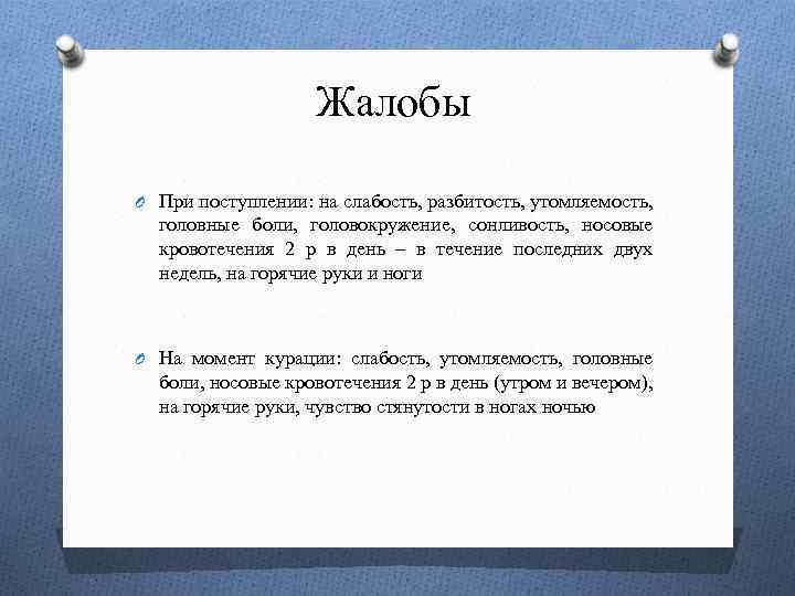 Жалобы O При поступлении: на слабость, разбитость, утомляемость, головные боли, головокружение, сонливость, носовые кровотечения 2 р в день – в течение последних двух недель, на горячие руки и ноги O На момент курации: слабость, утомляемость, головные боли, носовые кровотечения 2 р в день (утром и вечером), на горячие руки, чувство стянутости в ногах ночью