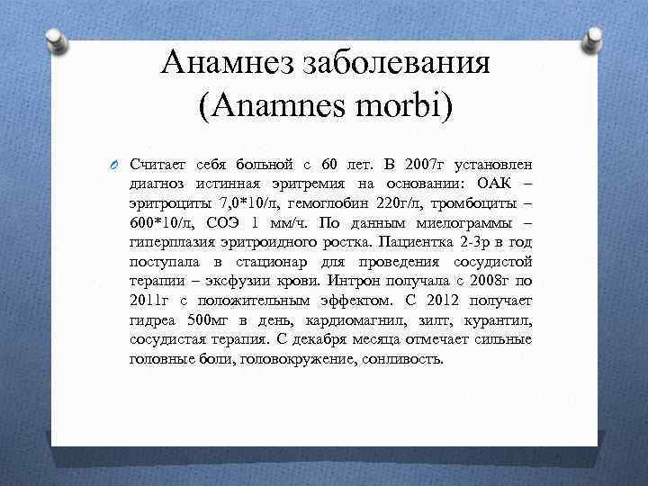 Анамнез заболевания (Anamnes morbi) O Считает себя больной с 60 лет. В 2007 г установлен диагноз истинная эритремия на основании: ОАК – эритроциты 7, 0*10/л, гемоглобин 220 г/л, тромбоциты – 600*10/л, СОЭ 1 мм/ч. По данным миелограммы – гиперплазия эритроидного ростка. Пациентка 2 -3 р в год поступала в стационар для проведения сосудистой терапии – эксфузии крови. Интрон получала с 2008 г по 2011 г с положительным эффектом. С 2012 получает гидреа 500 мг в день, кардиомагнил, зилт, курантил, сосудистая терапия. С декабря месяца отмечает сильные головные боли, головокружение, сонливость.