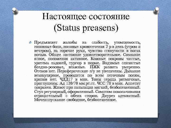 Настоящее состояние (Status preasens) O Предъявляет жалобы на слабость, утомляемость, головные боли, носовые кровотечения 2 р в день (утром и вечером), на горячие руки, чувство стянутости в ногах ночью. Общее состояние удовлетворительное. Сознание ясное, положения активное. Кожные покровы чистые, эритема ладоней, тургор в норме. Видимые слизистые бледно-розовые, влажные. ПЖК развита умеренно. Отеков нет. Периферические л/у не увеличены. Дыхание везикулярное, проводится по всем легочным полям, хрипов нет. ЧДД 17 в мин. Тоны сердца ритмичные, приглушены. Ад 120/70 мм. рт. ст. ЧСС 78 в мин. Аппетит сохранен. Живот при пальпации мягкий, безболезненный. Стул регулярный, оформленный. Симптом поколачивания отрицательный с обеих сторон. Диурез адекватный. Мочеиспускание свободное, безболезненное.