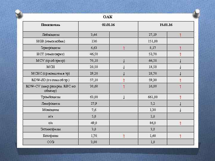 ОАК Показатель 02. 16 18. 01. 16 Лейкоциты 3, 44 27, 19 HGB (гемоглобин) 136 151, 00 Эритроциты 6, 63 HСТ (гематокрит) 46, 50 MCV (ср. об. эритр) 70, 10 MCH ↑ ↑ 8, 17 ↑ 52, 70 ↑ ↓ 64, 50 ↓ 20, 50 ↓ 18, 50 ↓ MCHC (ср. конц. гем. в эр) 29, 20 ↓ 28, 70 ↓ RDW-SD (ст. откл. об. эр. ) 57, 10 ↑ 59, 30 ↑ RDW-CV (шир. распред. RBC по объему) 30, 60 ↑ 26, 80 ↑ Тромбоциты 63, 00 ↓ 661, 00 ↑ Лимфоциты 27, 9 5, 2 ↓ Моноциты 7, 6 1, 30 ↓ п/я 5, 0 2, 0 с/я 49, 0 86, 0 Эозинофилы 3, 0 Базофилы 1, 70 СОЭ 3, 00 ↑ 1, 40 1, 0 ↑ ↑