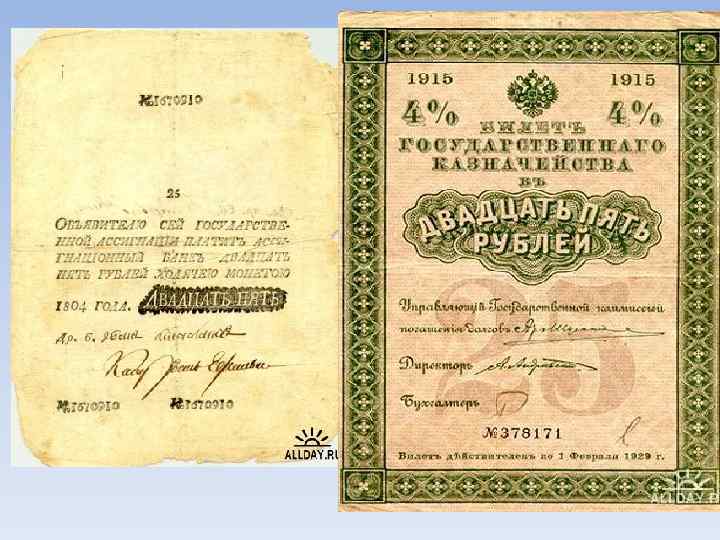 Бумажные деньги. • Бумажные деньги были изобретены в Китае в VIII веке. А в России бумажные деньги появились в 1769 г при Екатерине II. Их название «ассигнации» происходит от латинского «назначать, вводить в обращение» .