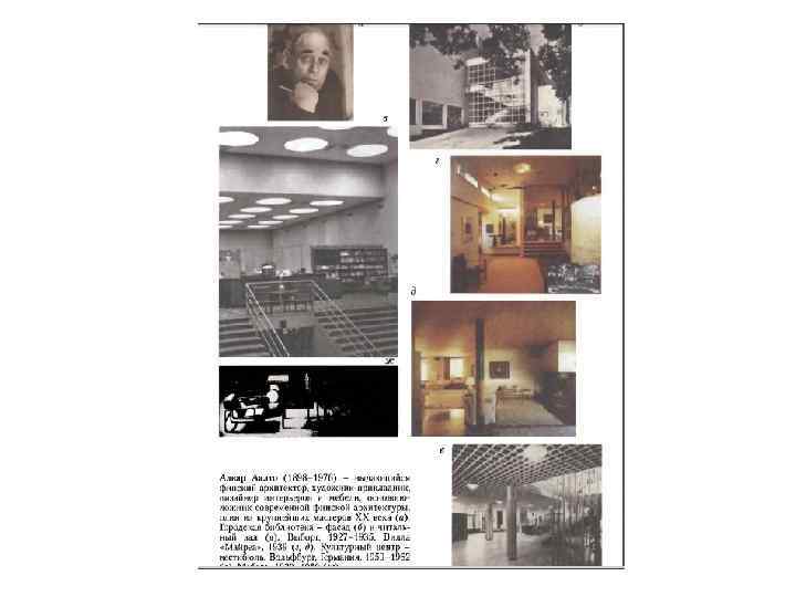 ДИЗАЙН СКАНДИНАВСКИХ СТРАН • • Процесс становления национальной школы Финляндии в архитектуре, изобразительном искусстве происходило на фоне тесных контактов с русской культурой. В 1848 году была основана Ассоциация художников Финляндии, в 1879 – общество «Друзья финляндского ремесла» ; в начале 1870 -х открывается Школа искусств и ремесел, переименованная в 1885 г. в Центральную школу прикладного искусства. При Политехническом институте в Хельсинки (1872) функционирует архитектурный факультет. Большое влияние на становление финского дизайна, формирование его национальных черт оказал архитектор А. Аалто, внесший весьма существенный вклад в европейскую и мировую культуру. Алвар Аалто (1898 -1976), выдающийся финский архитектор, художник-прикладник, дизайнер интерьеров и мебели, скульптор. В своем творчестве соединял принципы функционализма с национальными традициями финского искусства, стремился «гуманизировать интернациональный стиль» архитектуры с помощью «материалов и форм, сохраняющих тепло человеческих рук» . С 1939 года жил в США, преподавал там, одновременно продолжая работать для Финляндии и др. стран. Его стиль близок «органической архитектуре» Ф. Л. Райта. Уже в ранней своей работе - библиотеке в Выборге (1927 -1935) - он начал экспериментировать с освещением, которому придавал большое значение. Так, читальный зал, представляющий собой глухой объем (его стены оберегают читателей от внешнего шума), освещается сверху через круглые фонари, создающие равномерную освещенность всех мест. Белый цвет стен и потолка не только повышает общую освещенность, но и создает мажорный образ интерьера. Блестящим примером целостного решения среды стала вилла «Майреа» , спроектированная для художницы Майры Гулликсен (1938 -1939) и ее супруга - промышленника и большого любителя искусства Гарри. Дом имеет каркасную металлическую конструкцию и кирпичные стены. Для внутренней и наружной отделки Аалто широко использовал свой излюбленный материал - дерево, применяя различные его породы - сосну, березу, ель, тик.