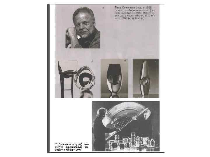• Тимо Тапани Сарпанева (род. в 1926), один из наиболее известных и самобытных финских дизайнеров плеяды 1950 -1960 -х годов, художник, график, скульптор, педагог. Работает дизайнером на ряде финских фирм, в т. ч. таких известных как «Ииттала» (стекло), «Розенлев» (металлические изделия) и др. , сотрудничает с зарубежными компаниями. В начале 1950 -х открывает собственное дизайнерское бюро. Получив ряд высших наград на Миланской триеннале 1954 года (скульптура из стекла), Сарпанева становится признанным мэтром. Среди его работ - павильон Финляндии на Скандинавской выставке дизайна и художественного ремесла (Швеция, 1955), финский павильон на Миланской триеннале (1957), выставки «Финляндия» во многих странах Европы и Японии (1961 -1964), финский павильон на ЭКСПО в Монреале (1967) и др. В середине 1950 -х годов Сарпанева создает для «Иитталы» так называемую «г-линию» - серии стеклянных изделий, упразднивших границу между дорогими произведениями искусства и дешевым потребительским стеклом. В основу этой серии заложены классические функционалистические принципы комбинируемое и взаимозаменяемости, штабелируемости и многофункциональности, стремление к внешней простоте и анонимности. Преобладают абстрактные, геометризированные формы, обогащенные мотивами биоморфности. Одновременно он продолжает работать как художник и скульптор, много времени посвящает книжной графике. В 1980 -е годы его страсть к «тайне формы» распространяется и на проблемы градостроительства: он создает серию архитектонических этюдов «Неополис» , которые в то же время можно рассматривать и как деревянную скульптуру. Работы Сарпаневы отмечены массой престижных наград, его произведения представлены в коллекциях многих музеев мира, а персональные выставки дизайнера, дважды демонстрировавшиеся в СССР, путешествуют по всему миру.