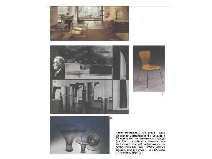 • Становлению дизайна Скандинавии в послевоенный период и его международному признанию в большой степени способствовала деятельность Т. Вирккалы. Тапио Вирккала (1915 -1985), по окончании войны оказался в эпицентре становления нового этапа развития финского дизайна. Сотрудничество с фирмой «Ииттала» , начавшееся после войны и продолжавшееся всю жизнь, сделала Вирккалу одним из символов возрождения финского дизайна. Вирккала, досконально изучает технологию производства, сам изготавливает мульды для отливки стекла, осваивает технику матирования, обработки поверхности алмазом и т. п. Одно из наиболее известных произведений - серия ваз «Кантарелли» ( «Лисички» , 1946) с тонким орнаментом в виде полос (пересказанная языком абстракции форма лесных грибов) производилась в течении 15 лет и пользовалась большой популярностью. Одновременно Вирккала занимается графикой, выигрывает конкурс на проект банкнот, объявленный Финским национальным банком (1946), разрабатывает серию марок к XV Олимпийским играм в Хельсинки (1952). В конце 1940 -начале 1950 -х годов он складывается и как дизайнер-выставочник. Триумфом финского дизайна и самого Вирккалы стали оформленные им экспозиции на триеннале в Милане (1951 -1954). Вирккала работает со многими известными зарубежными фирмами. В 1954 году он начинает сотрудничать с бюро Р. Лоуи (Нью-Йорк), разрабатывает столовые приборы, телевизоры и пр. Вернувшись в Европу, Вирккала начинает долговременное сотрудничество с фирмой Ф. Розенталя (ФРГ), изготавливающей мягких скульптурных линий и без декора. Работая в международном проектном дизайн-центре «Домус-тим» , он вместе с интернациональной командой создает «универсальный стиль» , пригодный в любом интерьерном дизайне, но в то же время позволяющий сохранить индивидуальную природу отдельных предметов. Сотрудничая с европейскими фирмами, в т. ч. итальянскими, и не прерывая работы у себя на родине, он создает самые разнообразные проекты от бытовых изделий до промышленного оборудования, от уникальных художественных произведений до широко тиражируемых вещей. В конце 1950 -начале 1960 -х го, создает проекты пластикового сервиза для германской авиакомпании «Люфтганза. Работы Вирккалы выставлялись более чем в 50 странах, в т. ч. в СССР (1981).