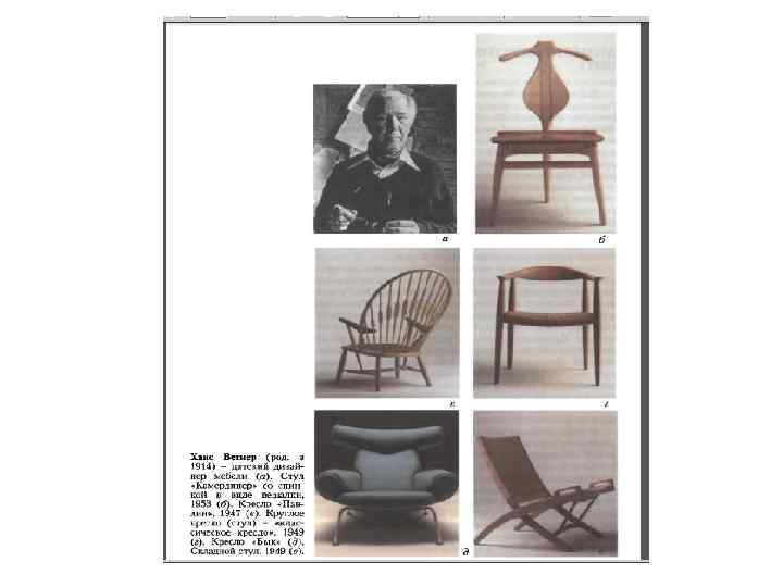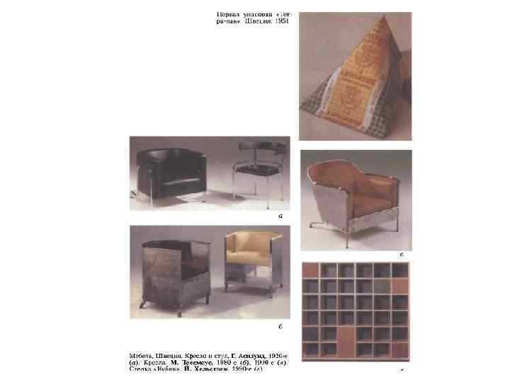 Дизайн Швеции • Вплоть до середины XIX века Швеция была преимущественно крестьянской страной, что повлияло на характер ее культуры, изобразительного и прикладного искусства. Формирование национальной школы архитектуры, живописи, графики и скульптуры (XVIIXIX вв. ) происходило в общем русле европейской художественной культуры. Шведов нередко называли «французами Севера» , т. к. различные художественные течения и направления, тенденции формообразования, приходившие из Франции, приживались здесь довольно легко. В начале XX века вместо французской изысканности начал развиваться стиль более тяжелый, более соответствующий вкусам средних слоев населения. Шведское Общество прикладного искусства оказывало исключительное влияние на новое искусство, содействуя его утверждению. Возникшее как Общество ремесел, оно было реорганизовано в соответствии с программой, подобной той, которую имел Германский и Австрийский Веркбунд (1914). Сотрудничество дизайнеров и промышленников не только повышало уровень вкуса публики, но способствовало созданию надежного рынка как кустарных изделий, так и машинной продукции. Деятельность Шведского Общества прикладного искусства по своему значению превосходила роль любой другой организации подобного рода. На протяжении 1920 -х годов на его долю приходилась почти вся работа по переоборудованию больниц и магазинов. Окраска в светлые тона и удобная мебель совершенно преобразили безрадостные и негигиеничные больничные палаты. В течение 3 -х лет (с 1923 по 1926) усилиями Общества были модернизированы три десятка больниц. Повсюду появлялись по-новому оформленные магазины и уличные витрины. Среди многочисленных результатов, которые были достигнуты за этот период, следует отметить, как один из главных, повышение спроса на труд архитекторов, дизайнеров, художников, столяров и других мастеров-ремесленников. Главные достижения шведского дизайна в 1930 е годы были связаны с мебелью и предметами домашнего обихода.