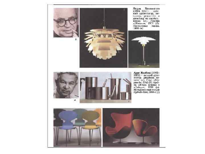 • Арне Якобсен (1902 -1971), датский архитектор, дизайнер по мебели и интерьеру, тканям, изделиям из стекла и металла, педагог. Творчество Якобсена развивалось в русле европейского модернизма, но в то же время было отмечено глубоко личностным подходом, вобравшим в себя рафинированную традицию датского проектного искусства. Якобсен был одним из первых проводников функционализма в Дании, хотя его ранние произведения 1920 -х годов тяготели к неоклассицизму. Уже первый большой проект - здание «Белла Виста» в Клампенборге (1933) – вдохновлен идеями Баухауза, стремлением к чистоте и ясности выражения функциональной целесообразности. В послевоенные годы, когда в Дании развернулись процессы индустриализации строительства, Якобсен еще больше утвердился в идее, что только архитектор может управлять новой технологией, препятствуя возникновению монотонных, выхолощенных структур. Проектирование отеля «Королевский» в Копенгагене (1959) значительно расширило диапазон дизайнерских работ Якобсена. По его личной инициативе архитектурный заказ был дополнен заказом на разработку всей материальной «начинки» здания - мебели, светильников, тканей, посуды, часов, столовых приборов и пр. Особое место среди этих произведений занимают два кресла скульптурных форм - «Яйцо» и «Лебедь» (1958), ставшие своего рода классикой и давшие импульс развитию новой стилистической линии в дизайне. Важным компонентом этого процесса было использование новых для мебельного дизайна материала и технологии - литых форм из стекловолокна. Интерес к материалу и технологии как факторам формообразующим, стимулирующим творчество пронизывает работы Якобсена. Штабелируемый стул «Ант» (1950), разработанный для спроектированного им здания столовой фармацевтической фирмы «Ново» в Копенгагене, выполнен из отформованной фанеры в соединении с металлическим каркасом, что время было новшеством. На основе этой идеи Якобсен разработал серии стульев самого разного назначения, одна из которых получила Гран-при на Миланской триеннале 1957 года. В 1952 году появился его стул «Муравей» , который фактически стал первой моделью подлинно массового промышленного выпуска и иконой скандинавского дизайна