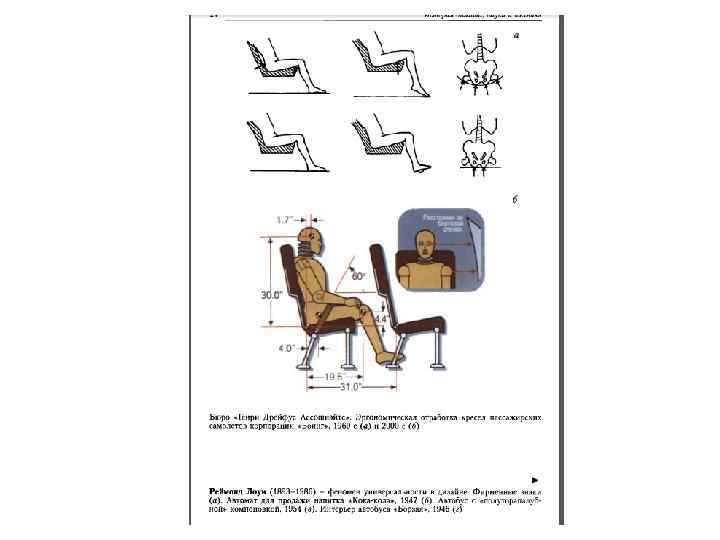 • Значительным позитивным вкладом в американский (да и международный) дизайн явилось практическое использование эргономики - научной дисциплины по учету человеческих факторов. Вскоре после Второй мировой войны Генри Дрейфус, работая над внутренним объемом тяжелого танка, создал с коллегами «антропометрические таблицы» , показывающие человеческое тело в различных положениях (соматография). В конце 1960 -начале 1970 -х годов дизайнерское бюро «Генри Дрейфус Ассошиэйтс» выполнило несколько разработок общественного транспорта, в том числе для авиации. При разработке самолета «Боинг-747» непосредственно в одном из лайнеров был смонтирован макет оборудования салона в натуральную величину. Это позволило инженерам ускорить выполнение расчетов конструкции и производственных чертежей. По тщательно разработанной методике были проведены эргономические исследования с участием физиолога. Специальное устройство «машина-сиденье» , состоящее из многочисленных небольших регулируемых по высоте подушек, дало возможность моделировать различные позы пассажиров. Результаты исследований позволили сформулировать требования в отношении оптимальных точек опоры, высоты, угла наклона и жесткости сидений, расстояния между ними и т. д.