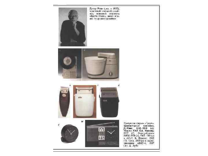 На общем фоне массы западногерманских товаров выгодно выделялись изделия компании «Браун» . Эта компания стала, в известном смысле, последовательницей итальянской фирмы «Оливетти» , которая впервые в Европе начала руководствоваться единой концепцией в дизайне своей продукции. Стиль компании «Браун» Основателем компании «Браун» , в которой в 1921 году изготавливались стандартное кухонное оборудование и электроприборы, был Макс Вильгельм Брауны пригласили для работы Г. Кирхе, преподававшего в Институте изобразительных искусств в Западном Берлине. В середине 1950 -х годов консультантами «Макса Брауна» становятся преподаватели Ульмской школы В. Вагенфельд и Г. Гугелот, Г. Кирхе к этому времени работал над графическим фирменным стилем, в т. ч. оформлением офисов и магазинов, а также созданием нескольких проектов секционной мебели. В 1955 году на должность архитектора фирмы зачисляется прошедший по конкурсу Д. Рамс. Дитер Рамс (род. в 1932), один из самых известных и авторитетных немецких дизайнеров, основной создатель «Браун-стиля» . После окончания Школы художественных ремесел в Висбадене два года работал в архитектурном бюро Отта Апеля. Начав работу в фирме «Макс Браун» архитектором (1955), он с 1961 года возглавлял отдел дизайна, с 1968 года стал директором этого отдела, а с 1988 года - генеральным уполномоченным компании. Почти все ведущие дизайнеры «Брауна» были связаны с проектированием мебели и это наложило отпечаток на формообразование создаваемой ими продукции в традиционном функциональном ключе, но в новой стилистике. Тем более, что «прямоугольность, коробчатость» аппаратуры хорошо согласовывались с секционной панельной мебелью. Сенсацию на рынке произвела модель радиоприемника со встроенным проигрывателем SK 4 дизайнеров Г. Гугелота и Д. Рамса (1956). За радиолой последовали другие изделия, в которых получила выражение дизайнерская концепция компании и сложился легко узнаваемый и ставший широко известным «Браун-стиль» . В течение тридцати лет только Д. Рамсом были спроектированы более 500 изделий: радиоаппаратура, электрические часы, тепловентиляторы, утюги, кофеварки, миксеры, бритвы и пр. Уделяя большое внимание инновациям, Рамс предложил: прозрачную крышку на проигрывателе; выпуклые, а не вогнутые, кнопки управления; ручку фена под углом, чтобы удобнее сушить волосы сзади; самую распространенную ныне конструкцию кофеварки - цилиндр с фильтром и емкость для воды вставлены друг в друга – и пр.