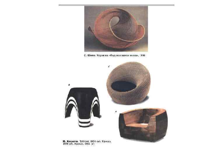 • • • В Западной Германии выделяются две постройки А. Аалто – культурный (19591962) и религиозный (1965 -1968) центры в г. Вольфсбурге. Наиболее эффектной частью культурного центра является «веер» аудиторий, выходящих на площадь фасадами, облицованными белым и голубым каррарским мрамором в сочетании с памирским сиенитом; интересно решен вестибюль постройки. В религиозном центре выделяется своим решением церковь - ее трапециевидное в плане пространство перекрыто железобетонными наклонными рамами, потолок между которыми обшит деревом. Полы облицованы керамической плиткой. Стены всех сооружений выполнены в беленом кирпиче и бетоне; крыши медные. Еще в начале 1930 -х годов А. Аалто начал эксперименты с конструкцией и технологией мебели. Им создается новый тип мебели с использованием обычных листов фанеры, но специфически обработанных. На основе специального метода распиловки и последних для тех лет достижений химии готовились «деревянные макароны» - эластичные заготовки, которые можно было изгибать, почти не ограничивая фантазию. Гнутое дерево мастер использовал также для больших декоративных панно и скульптур. Многие образцы мебели, осветительной арматуры, скобяных изделий и пр. , созданные для конкретных архитектурных объектов, интерьеров, обрели самостоятельную жизнь и воспроизводятся серийно. В конце 1940 -начале 1950 -х годов доминирующие позиции на международных Триеналле в Милане и других престижных выставках начинают занимать представители Финляндии. Так, в 1951 году они удостоились 6 -ти «Гран-при» , 7 ми Золотых и 8 -ми Серебряных медалей. Кай Франк, Тапио Вирккала и Тимо Сарпанева становятся первыми звездами европейского дизайна, а затем завоевывают славу больших мастеров в Америке.