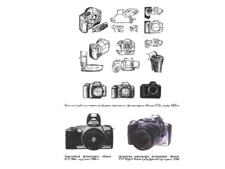 • Фирма ≪Кенон≫- в 1960 -е годы боролась за право занять ведущее место в производстве кино- и фотоаппаратуры. Совершенствуя технические параметры, снижая вес моделей, большое внимание уделялось удобству и простоте эксплуатации, а также не просто эстетическому совершенству формы, но поискам оригинальных решений. Главным дизайнером фирмы был Хироси Синихара. В полуформатной камере «Кенон Dial 35≫ (1963) появился ряд решений, непривычных для данного вида изделий. В целом традиционный коробчатый, небольшой толщины объем камеры получил не горизонтальное, а вертикальное развитие, благодаря головке пружинного привода, служившего одновременно рукояткой для удержания аппарата в руках. Устройство ввода значения светочувствительности пленки и величины выдержки в систему автоматики напоминало наборный телефонный диск, что оказалось шокирующим для фотолюбителей. Несмотря на явно улучшенные технико-эксплуатационные параметры, фотоаппарат не имел коммерческого успеха и был снят с производства. Покупатель не принял новую модель из-за резких отличий внешней формы от традиционного формообразования. К доработке формы аппаратов была привлечена группа дизайнеров, члены которой сначала работали индивидуально каждый из них дал свои рекомендации, а затем все предложения были обобщены и воплотились в новую форму. Форма первого цифрового зеркального фотоаппарата «Кенон EOS Digital Rebel» (2004) при смягченной пластике элементов и контрастном черно-белом цвето-фактурном решении даже отдаленно не напоминает концептуальную модель Л. Колани «Супер-Био» .