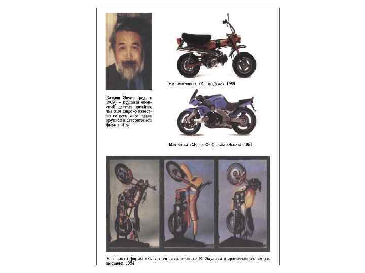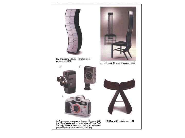 • • ≪Независимые≫ дизайнеры работали в собственных небольших бюро и, как правило, выполняли заказы широкого ассортимента (машины, приборы, мебель, светильники, посуда, упаковка и т. д. ). В конце 1960 -х годов их было порядка двух тысяч. Они сотрудничали как со средними производителями бытовых изделий, так и с крупными фирмами. Среди этой категории дизайнеров выделяется Сори Янаги. Его творчество примечательно смелым использованием традиций многовекового ремесла в современных промышленных изделиях. Надо отметить удивительную свободу японских дизайнеров в проектировании мебели, в частности, всевозможных сидений. Не связанные со сложившимися на Западе схемами, они вносят даже в самые, казалось бы, прочно утвердившиеся во всем мире формы что-то свое, придавая мебели элементы одушевленности. Табурет-стул «Бабочка» Янаги из двух свободно изогнутых деревянных листов поражает сочетанием функциональности, технологичности и образности. На Миланской триеналле 1958 года Янаги получил за это изделие Золотую медаль. Успешно проектируя бытовые вещи различных назначений, он стал победителем Всеяпонского конкурса промышленных дизайнеров. Фирма ≪ГК≫. Кендзи Экуан Среди старейших независимых бюро широкого профиля своей высокой профессиональной репутацией выделяется бюро, первоначально называвшееся «Группа ГК» , возглавляемое Кендзи Экуаном. Кендзи Экуан (род. в 1929) крупный японский деятель дизайна, чье имя широко известно во всем мире. Экуан многократно посещал Советский Союз, участвовал в семинарах «Интердизайн» . С 1950 года Экуан учился в Токийском университете изящных искусств и музыки. Он три года учился делать своими руками шкатулки, шелковые подушечки и т. д. К концу третьего курса, понимая, что японскому потребителю нужны, в первую очередь, красивые и добротные утилитарные вещи (велосипеды, посуда, сумки), предложил администрации университета принести в аудиторию американский велосипед, изучить его, разобрав по частям, и самим постараться спроектировать еще лучшее изделие.