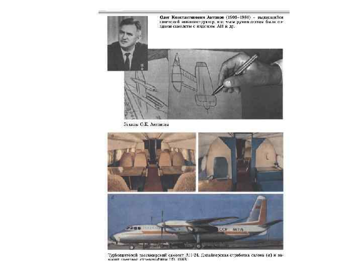 Олег Константинович Антонов (1906 -1984) – выдающийся советский авиаконструктор, органично сочетавший в себе талант конструктора, ученого и руководителя-организатора. Он был убежденным проводником идей дизайна, многие годы входил в редакционный совет журнала «Техническая эстетика» . В ОКБ Антонова при активном использовании принципов дизайна была разработана целая серия гражданских самолетов - бипланов с комплексной механизацией крыла. Начало этой серии положила модель Ан-2, которая стала удивительным примером длительной устойчивости формы и образа самолета, что совершенно не характерно для авиации, где непрерывно происходит смена моделей. Ан 2 находился в массовом производстве свыше 40 лет, изготавливался не только в СССР, но также в Польше и КНР. • В ОКБ с начала 1960 -х годов работала группа профессиональных художников-конструкторов. Первым результатом ее работы стали интерьеры самолета Ан-24: пассажирский салон, отделка кабины пилотов, буфет, туалет. Особое внимание было уделено цвето-фактурному решению, поиску наиболее приемлемых отделочных материалов, их гигиеническим и декоративным характеристикам. Были предложены несколько вариантов суперграфики на наружных поверхностях машины. Сам O. K. Антонов был художественно одаренным человеком, ярким представителем инженерного дизайна в авиастроении, проследователем идей о сочетании эстетическогои функционального в технике.