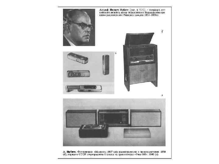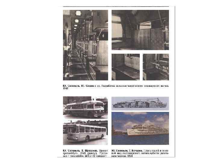 • • Группа художественного конструирования была создана и на заводе ВЭФ в г. Риге (вторая половина 1940 -х). Ее возглавлял известный латвийский художник Адольф Янович Ирбите (род. в 1910). Во всем мире были широко известны созданные им в 1930 -е годы радиоприемники и уникальный минифотоаппарат «ВЭФ-Минокс» (1937). Вся бытовая техника, выпущенная заводом ВЭФ с 1935 по 1968 год, была сделана по замыслам А. Ирбите. С 1960 года он работал на Рижском радиозаводе им. А. С. Попова. В его творческом активе первые в СССР переносной приемник «Турист» (1959) и малогабаритный транзисторный приемник «Гауя» (1961), первая в стране стереорадиола «Ригонда-стерео» (1963) и многие другие. Работы Ирбите неоднократно отмечались высшими наградами Всемирных выставок, в том числе в Париже (1937), Брюсселе (1958) и др. Он также много работал в прикладной и книжной графике, создал много каталогов и проспектов, фирменных знаков и упаковок. А. Ирбите было присвоено почетное звание заслуженного деятеля искусств Латвийской ССР (1964). Он был принят в члены Союза художников республики и многие годы руководил секцией дизайна при Союзе, которая регулярно с 1968 года организовывала свои выставки. В конце 1945 года министр транспортного машиностроения В. М. Малышев поручил вагоностроительному заводу им. М. Калинина в подмосковном Лианозово разработать цельнометаллический вагон, соответствующий современному уровню техники. Заводские конструкторы, понимая всю сложность задачи, пригласили к совместной работе Юрия Соловьева, тогда еще молодого начинающего дизайнера. В начале 1946 года фактически впервые в нашей стране был применен принцип наглядного сравнения конструкторского и дизайнерского проектирования: были построены в натуре два варианта пассажирского некупированного цельнометаллического вагона. По стилю вагон Соловьева представлял собой геометрический функционализм с элементами обтекаемого стиля и применением авиационных технологий (гнутая фанера на каркасе для полок, светлый лак, фурнитура из алюминиевого сплава с анодированием). Была предложена оригинальная конструкция крепления верхних полок, откидных столиков, введены складная лестница и зеркала, зрительно увеличивающие пространство салона. Рельефные ребра жесткости, накладные металлические декоративные полосы, уступы в формах для пепельниц и плафонов светильников подчеркивали зрительное движение в глубину. Этот проект был признан лучшим и многие годы выпускался промышленностью почти без изменений.