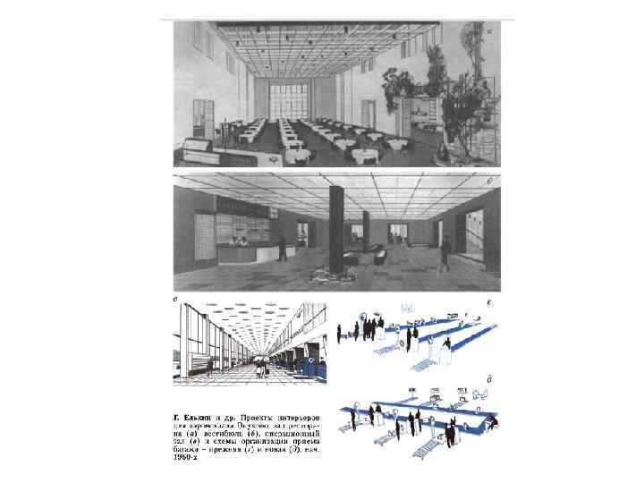 • • В 1950 -е годы были возрождены службы Аэрофлота и разработан их фирменный стиль; построены новые аэропорты в Москве и Ленинграде. Прогресс воздушного транспорта шел главным образом за счет развития авиационной техники, в то время как организации и совершенствованию технологического процесса обслуживания авиапассажиров уделялось недостаточное внимание. На коротких маршрутах (до 1000 км) время, затрачиваемое пассажирами на наземные операции, в несколько раз превышало время полета. Это стало особенно ощутимым после внедрения в эксплуатацию газотурбинной, а позднее - реактивной техники. В эти годы на линии вышли первые реактивные и турбореактивные самолеты. В июле 1956 года в воздух поднялся первый советский реактивный пассажирский самолет ТУ-104. Первые самолеты этого типа, несмотря на сверхсовременный внешний вид, внутри были оборудованы как интерьеры поездов мебелью в «русском стиле» с вышитыми занавесками и домашними настольными лампами. Архитекторам и художникам-конструкторам пришлось решать новые непривычные функциональные задачи - не только оборудование залов ожидания, устройство информационных табло, проектирование стоек для оформления билетов и сдачи багажа, разработка мобильных трапов, но и искать новую концепцию обслуживания пассажиров. Наиболее рациональная схема была осуществлена в Москве. Было организовано комплексное обслуживание пассажиров в городе с последующей доставкой их автобусами-экспрессами непосредственно к трапу самолета, минуя вокзал аэропорта. Следующим этапом стало совершенствование технологии обслуживания авиапассажиров. Архитекторы Г. Елькин, Г. Крюков, Ю. Филенков и др. совместно с работниками аэропортов Внуково и Шереметьево, используя методы дизайна, разработали и внедрили ряд новшеств. В том числе метод свободного приема багажа, самообслуживание при выдачи и др. с применением средств механизации. Были предложены новые решения интерьеров аэровокзалов и нового оборудования для них.