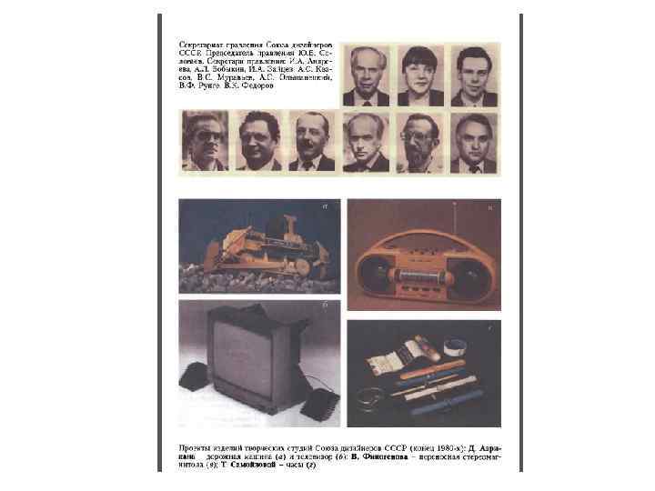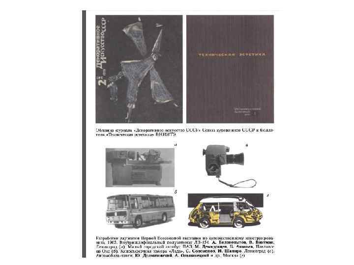 • • 1965 год - год Первой всесоюзной выставки и на ее базе конференции по художественному конструированию (июль). Около 700 представителей промышленности, учебных заведений, творческих союзов архитекторов и художников, проектных и конструкторских организаций при участии делегаций ряда европейских социалистических стран подвели первые итоги становления дизайна в СССР, определили важнейшие задачи и пути их решения. Лучшие экспонаты выставки были впервые отмечены комплектами медалей ВДНХ СССР (Золотыми, Серебряными и Бронзовыми). Тремя лучшими проектами были названы: специализированный автомобиль- такси (Ю. А. Долматовский и др. , ВНИИТЭ - внутришлифо- вальный полуавтомат Л 3 -154 (А. Е. Белокопытов и В. Э. Винтман, Ленинград) и комплексное оборудование цеха приборостроительного завода (В. М. Шпак и др. , Москва). Приоритетным направлением внедрения методов художественного конструирования в промышленность была продукция машиностроения, что было заложено уже в самом Постановлении 1962 года. Не случайно поэтому широкий резонанс получило проектирование во ВНИИТЭ гидрокопировального токарного полуавтомата для итальянской фирмы UTITA (1972 -1973). Годом фактического создания единой государственной системы художественного конструирования страны под эгидой ГКНТ Совета Министров СССР можно считать 1966 год. Основными элементами этой системы стали: ВНИИТЭ и его филиалы: Азербайджанский (Баку), Армянский (Ереван), Белорусский (Минск), Вильнюсский, Грузинский (Тбилиси), Дальневосточный (Хабаровск), Киевский, Ленинградский, Уральский (Свердловск) и Харьковский; отраслевые СХКБ (в т. ч. Минлегмаша и «Эстел» , Москва) и др. головные художественно-конструкторские организации союзных и республиканских министерств; художественноконструкторские подразделения (отделы, КБ, группы) предприятий, НИИ, СКБ и др. организаций. Роль ВНИИТЭ стала более действенной не только в методически-консультативном, но и контрольноэкспертном плане с введением государственной аттестации промышленной продукции (1967). Без положительного заключения Института по потребительскому, в том числе эстетическому, уровню изделия не могли получить право на простановку Знака качества. Получение такого Знака давало не только реальную надбавку к цене изделия. Процент аттестованной продукции был одним из главных показателей работы предприятия и жестко контролировался правительственными и партийными органами. Принципиальная позиция сотрудников ВНИИТЭ при проведении экспертизы, вынуждавшая предприятия существенно повышать качество продукции, сыграла весьма положительную роль во внедрении методов художественного конструирования.