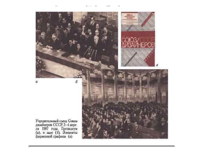 • • 3 апреля 1987 года в Колонном зале Дома Союзов в Москве собрались на Учредительный съезд Союза дизайнеров СССР. Они представляли практически все направления дизайнерской деятельности всех 15 -ти республик и всех отраслей промышленности Советского Союза, специалистов по теории и методологии дизайна, по подготовке дизайнерских кадров. Съезд, прошедший в приподнято-праздничной и очень деловой обстановке, после программного доклада Соловьева, обсуждения доклада (выступили более 50 делегатов) утвердил Устав Союза дизайнеров СССР (СД СССР), постановил считать всех делегатов членами Союза, тайным голосованием избрал правление в составе 92 -х человек и ревизионную комиссию. Пленум правления Союза дизайнеров СССР единогласно избрал председателем правления Ю. Б. Соловьева, по предложению которого были избраны восемь секретарей правления - И. А. Андреева, главный искусствовед Общесоюзного Дома моделей одежды; A. JI. Бобыкин, член художественноэкспертной коллегии Управления изобразительных искусств Министерства культуры СССР; И. А. Зайцев, главный художник-конструктор АЗЛК; А. С. Квасов, ректор МВХПУ (б. Строгановское); B. C. Муравьев заведующий кафедрой промграфики и упаковки ЛВХПУ им. В. И. Мухиной; А. С. Олыианецкий, главный художник-конструктор проектов ВНИИТЭ; В. Ф. Рунге, начальник отдела, главный художник-конструктор ПО «Красногорский завод им С. А. Зверева» ; В. К. Федоров, начальник специального художественноконструкторского бюро «Эстэл» . Девятым секретарем (по оргвопросам) позднее стал М. Е. Яковлев, зав. отделом ВНИИТЭ. Важнейшими задачами Союза дизайнеров (не забывая о декларированном повышении качества промышленной продукции и всей среды жизнедеятельности) представлялись: • покончить с существующей в стране практикой анонимности в сфере дизайна; • создать альтернативную государственной систему дизайн-студий, мастерских и других творческопроизводственных структур с право юридического лица; • обеспечить дизайнерам различных видов деятельности условия для более широких контактов между собой и представителями других творческих профессий внутри страны и, особенно, с зарубежными коллегами, в том числе для совместной работы с ними качества продукции. Процедура приема в члены СД отличалась, с одной стороны, демократичностью, гласностью, свободным обменом мнениями, с другой – требовательностью к профессионализму кандидатов, новизне и оригинальности, весомости и практическому использованию их работ.
