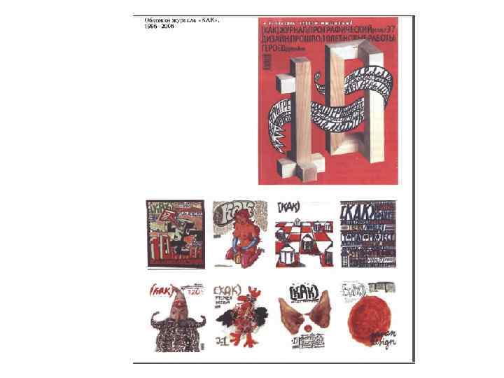 • • Графический дизайн С 1980 -ми годами связано начало нового этапа в отечественном графическом дизайне. Формирование новой творческой концепции проходило в условиях изменения социального контекста в обществе и нарождающихся в этой связи общекультурных тенденций. К концу прошлого века графический дизайн, специальность «дизайнер-график» стали весьма востребованными в новых социально- экономических условиях. Валерий Сергеевич Акопов (род. в 1938) - представитель поколения профессионалов, сложившегося в 1960 -е годы. Большая часть его творческой деятельности связана с Мастерской прикладной графики Художественного фонда РСФСР, где он начал работать, будучи еще студентом Полиграфического института, который окончил в 1961 году. в таких разработках как система пиктограмм для Московской олимпиады, фирменного стиля объединения «Проммашэкспорт» ( «ПРОМО» ) и др. Владимир Чайка (род. в 1955) - весьма своеобразная творческая личность. После окончания Строгановки он работал в Худфонде РСФСР, где были сосредоточены лучшие силы московского графического дизайна. Здесь Чайка выполнил ряд крупных проектов, составивших ему имя в профессиональных кругах: фирменные стили Внешнеторгового объединения «Технопромэкспорт» , Государственных музеев Московского Кремля (совместно с М. Жуковым), Центра моды «Люкс» и др. Журнал про графический дизайн ≪КАК≫ выходит с 1996 г. , что для специализированного дизайнерского издания является удивительным явлением. Шесть лет просуществовал пользовавшийся авторитетом и популярностью санкт-петербургский журнал «Мир дизайна» ; вышли всего несколько номеров издания «Союз дизайнеров» (Москва) и т. д. Журнал «КАК» (главный редактор Петр Банков), в котором основное внимание уделяется типографике, делается молодыми и, в основном, для молодых. Он знакомит с творчеством отечественных и зарубежных дизайнеров-графиков, прежде всего авангардных направлений.