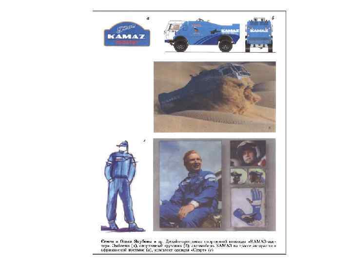 • Дизайн-программа ≪КАМАЗ-мастер≫ Дизайн-программа спортивной команды «КАМАЗ-мастер» была разработана с целью продвижения торговой марки ОАО «КАМАЗ» на мировом рынке через создание средствами дизайна привлекательного образа спортивного автомобиля, команд камазовских спортсменов и, как следствие, самого автозавода. В дизайн-программу для проектирования вошли следующие темы: спортивный грузовой автомобиль (графика, кабина, кузов, рабочее место экипажа); экипировка (фирменный флаг, комбинезоны, средства индивидуальной защиты, аксессуары, бивуак команды); полиграфия (книга, буклет, открытки, конверт, диплом, визитные карточки, календари); Интернет (сайт команды); выставки и пресса. Спортивный грузовик центральный элемент дизайн-программы – является олицетворением скорости и богатых конструкторских фантазий. Хорошие аэродинамические показатели обеспечены силуэтом автомобиля и подтверждены при испытаниях на специализированном полигоне. Силуэт машины распределяет верхние и нижние слои набегающего потока воздуха, позволяя телу грузовика как бы скользить между ними. Цветографическое решение автомобиля легло в основу художественного образа комплекта спортивной одежды и аксессуаров. Особое внимание уделялось обеспечению эргономических и гигиенических требований. Запоминающийся образ ансамбля определяется сочетанием белого, синего кобальта и темно-синего цветов. Цвета расположены сверху вниз. Комплект дополняется фирменными нашивками. Дизайн-программа команды «КАМАЗмастер» как синтез творчества, производства и спорта служит примером завоевания симпатий миллионов болельщиков и продвижения заводской марки на мировом рынке. Ее создатели Семен и Ольга Якубовы, В. Чагин, Ф. Кабиров и другие удостоены Государственной премии в области литературы и искусства (дизайн) за 2000 год.