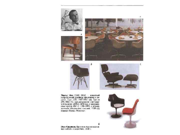 • Ээро Сааринен (1910 -1961), известный американский архитектор и дизайнер, оказал заметное влияние на американскую и мировую архитектуру. Переосмыслив принципы функционализма, он создал удивительнейшие архитектурные скульптуры. Сааринен видел различие своих произведений в соответствии с различием программ, из которых они вытекали: тщательный функциональный анализ программы был фундаментом его метода, а выразительность его произведений всегда соответствовала психологическим требованиям программы. Другим принципом его творческого метода было ведение работ по проектируемому объекту на макетах, что позволяло более точно регулировать размеры и форму деталей. Это обусловило индивидуализацию архитектуры зданий. Параллельно с архитектурной деятельностью Сааринен совместно с Ч. Имзом (с 1940), проектировал мебель, в которой он «спас» искусственный пластик как материал. Общая работа Имза и Сааринена (ансамбль, включавший столы, шкафы и стулья с сидениями из гнутой фанеры) была отмечена Первой премией на конкурсе-выставке «органической мебели» в Музее современного искусства (Нью. Йорк, 1941). В середине 1950 -х годов Сааринен создал коллекцию мебели «Пьедестал» , в которую вошли круглые столы, стулья и кресла из белого пластика на центральной металлической опоре круглой формы. Эта необычно легкая мебель изящных очертаний (производитель фирма «Нолл» ) стала широко известной во всем мире.