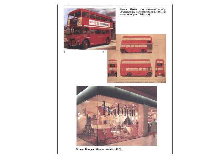 • Автобус ≪Рутмастер≫, двухэтажный, красного цвета, мгновенно вызывающий ассоциации с Лондоном середины 1950 -х годов и более позднего периода, спроектировал Дуглас Скотт (1913 -1990) - первый профессиональный промышленный дизайнер Великобритании. Работал в Лондонском бюро Раймонда Лоуи (1936 -1939), после Второй мировой войны открыл собственное бюро. Во многом усвоил приемы творчества и подход к проектированию американской школы, стремился создавать практичные, пользующиеся успехом и технологичные в изготовлении изделия. Считал, что в промышленном дизайне нет места для индивидуального самовыражения художника. Автобус «Рутмастер» (1954), сменивший угловатую, неповоротливую предыдущую модель, имел алюминиевый кузов, собираемый по авиационной технологии. Был прочным и достаточно легким. Компактная, цельная в аэродинамической стилистике форма за счет криволинейных с небольшими наклонами обводов получила зрительную завершенность и выразительность.