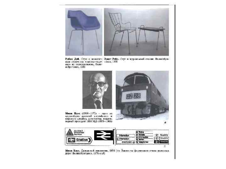 • • Британское Общество промышленных художников и дизайнеров, крупнейшее в Европе, которое было образовано в 1930 году, объединило творческих специалистов, работавших в традиционных отраслях (мебель, текстиль, керамика и пр. ), а также в машино- и приборостроении, промграфике. Уместно вспомнить, что первая организация, созданная с целью поднятия качества промышленной продукции и существующая до сих пор - это Королевское общество искусств, основанное в 1754 году. Это общество в 1936 году учредило звание «Королевский дизайнер промышленности» , которое могут носить не более 50 -ти человек. В 1964 году, на момент выставки в Москве, их было 48 - сорок восьмым был назван Алек Иссигонис, автор автомобиля «Мини» . По инициативе Британског о Общества промышленных художников и дизайнеров, поддержанной дизайнерскими организациями США, Италии и Франции, в 1957 году был организован ИКСИД, первым президентом которого стал Миша Блэк (1910 -1977), один из крупнейших деятелей английского и мирового дизайна, архитектор-педагог. Родился в Баку, в Англию уехал с родителями в 1912 году. Много работал в области проектирования изделий бытового назначения, интерьеров общественных зданий. Большую известность получил как выставочный дизайнер, в частности, как автор экспозиции «Британия это может» , выставки ЮНЕСКО в Мексике и Израиле (1947 -1953) и др. В 1954 - 1955 -х годах Блэк - президент Общества промышленных художников и дизайнеров. Будучи первым президентом ИКСИД (1959 -1961), Блэк принимал самое активное участие в работе этого общества. Талант Блэка как практика, идеолога и организатора дизайнерской деятельности в полной мере проявился в его преподавательской работе в Королевском колледже искусств (1959 -1977).