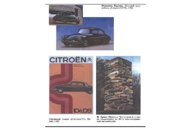 • • Фламинио Бертони (1903 -1964), скульптор, пионер французского промышленного автомобильного дизайна, приехал во Францию в 1923 году, с 1935 года работал на «Ситроене» . Он одним из первых попытался соединить в дизайне легкового автомобиля функцию и лишенную декора форму. Источником вдохновения послужил концептуальный эскиз «Автомаксимум» (1928) знаменитого архитектора Ле Корбюзье при участии Пьера Жаннере. «Ситроен 2 CV≫ должен был стать одной из новинок Парижского автосалона 1939 года, но началась Вторая мировая война. Вся небольшая партия машин, чтобы та не досталась немцам, была уничтожена; остался только один спрятанный экземпляр. С небольшими доработками модель дебютировала на открытии Парижского салона 1948 года, где привлекла внимание своим необычным и неприглядным видом. Однако автомобиль, неожиданно приобрел большие популярность и спрос. Его модификации выпускались во Франции по 1988 год, а в португальском филиале - по 1991 год, превысив общий тираж в б млн. Четыре пассажира, 50 кг поклажи, небольшой расход топлива, скорость до 95 км/час, простота в эксплуатации при невысокой стоимости (вдвое ниже дешевой «Хонды Сивик» в 1987) - вот секрет успеха. Необычная форма даже стала достоинством - машина была мгновенно узнаваема и не нуждалась в рекламе. Автомобиль ≪Ситроен DS 19» , сенсационно представленный на салоне 1955 года в Париже, продемонстрировал всю неординарность таланта дизайнера Фламинио Бертони и передовые позиции инженеров под руководством Андре Лефевра. В конструкции модели было много необычного: двухобъемный кузов «седан» ; гидропневматическая подвеска, обеспечивающая плавный ход и возможность изменения использовать машину как семейную, санитарную, грузовую и т. д. ; коробка передач с гидроприводом и пр. Но еще сильнее поражал дизайн: смещенный вперед динамичный силуэт; обтекаемый кузов с пластмассовой полупрозрачной крышей и иллюзорными (тонкими) стойками при большом ( «огромном» ) остеклении; ровные и свободные от орнамента боковины, динамично падающий вниз капот, под которым зияла щель, заменившая привычную решетку радиатора. Внутри - просторный салон, хорошая отделка и футуристическая панель управления с рулевым колесом на одной спице. Автомобиль произвел настоящий фурор (за первые 45 мин. торговли поступили 749 заказов, а в конце дня их оказалось 12000). Он открыл новую эру в истории автомобиля и заслужил прозвище «Богиня» ( «Deesse» ). За 20 лет были выпущены без малого 1, 5 млн экземпляров.