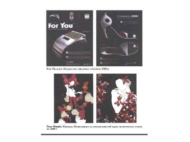 • • • Михал Батори, родился в 1959 году в Лодзи, в Польше, там же учился в Национальной школе изобразительных искусств. В 1987 году переехал во Францию, но лишь в 1995 году приобретает известность, начав сотрудничать с фирмами в Париже. На его творчестве, безусловно, сказывается влияние польской школы, но лаконичность и оригинальность создаваемых им образов делают их единственными в своем роде. Ему свойственно пристрастие к коллажу, знаковости, игре масштабов в сочетании с совершенным владением типографикой. Ито (Ито Морабито, род. в 1978) - заявил о себе представляя лица самых знаменитых мировых брэндов. Ито осуществлял фантомные рекламные кампании, создавал аксессуары (сумки, туфли), мебель и даже виллы, существующие, к сожалению, только на бумаге. Однако мировые брэнды были не в обиде на него, некоторые даже черпали в этих фантомах новые идеи. В 2000 -м году Ито и его постоянный соратник Маттео организовали студию Ора-Ито (через 2 года там работали 7 человек). Успех не заставил себя долго ждать: дизайнерская пресса хвалила его за то, что он сумел-таки расшевелить стерильный и тоскливый мирок парижского шика, выпуская фальшивую рекламу и элегантно эксплуатируя бизнес -эффект. Появились реальные заказы самых престижных фирм - заказы, которые теперь столь же масштабны, как и его фиктивные проекты вроде виллы для Джеймса Бонда на Ближнем Востоке или дома для некоего шейха на Лазурном берегу. Пьер Фишфе (род. в 1977) - иллюстратор, который хотел бы оставить свой след в мире моды. Ему интересна сама одежда как таковая, а не весь тот антураж, связанный с ее появлением на подиуме. В его творчестве заметно явное влияние художников Густава Климта (модерн) и Роберта Раушенберга (поп-арт).
