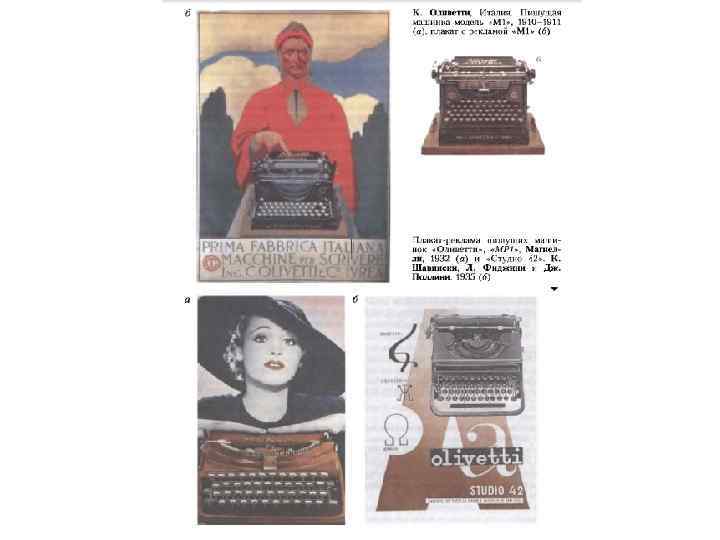 • Основы итальянского промышленного дизайна закладывались еще до Второй мировой войны. Фирма ≪Оливетти≫ первой в Европе привлекла к рекламе своей продукции поэтов и художников (1927), а со временем объектом художественного творчества стала ее продукция. В историю промышленности и бизнеса, культуры и дизайна фирма «Оливетти» вошла благодаря большим и плодотворным усилиям по формированию своего имиджа, своего стиля как синонима высокого искусства. Особым направлением в деятельности Андриано Оливетти (1901 -1960)стало целенаправленное формирование фирменного стиля, включившее обширную культурную и рекламную программу, комплексную разработку фирменной графики. В 1927 году начинают трудиться на «Оливетти» график Джованни Пинтори, ученик педагога Баухауза Мохой-Надя, Ксанти Шавински, скульптор Константино Нивола, инженер и поэт Леонардо Синисгалли. В 1931 году создается специальный отдел развития и рекламы под руководством Ренато Дзветеремича. 1932 год ознаменовался выпуском первой портативной модели - «МП 1» , спроектированной Альдо Магнелли совместно с братом - живописцемабстракционистом Альберто. Эта модель ознаменовала радикальное изменение облика пишущей машинки - от традиционной высокой формы к развитой по горизонтали с превращением корпуса в самостоятельную пластическую оболочку, относительно независимую от конструктивного решения механизмов. Модель «Студио-45» (1935) стала плодом сотрудничества Шавински и архитекторов-рационалистов Л. Фиджини и Дж. Поллини