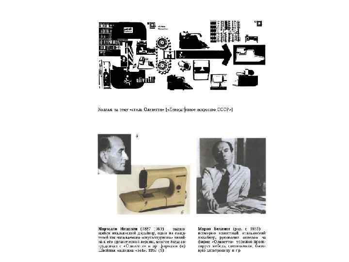 • • • Превращение формируемого фирменного «стиля Оливетти» в полноценное стилистическое направление произошло в 1940 -1950 -е годы талантом Марчелло Ниццоли (1887 -1969), сотрудничавшего с фирмой со второй половины 1930 -х. Модели Ниццоли, прежде всего, пишущие машинки «Лексикон-80» (1948) и «Леттера-22» (1950), ставшие «манифестом» органического стиля. Скульптурность пластики, соединившая в себе художественную концепцию и новую на тот момент технологию литья под давлением, ознаменовала рождение понятия «Линия Ниццоли» . Эта «линия» нашла свое отражение и в швейной машинке «Мирелли» (1957). Новые этапы развития дизайна на «Оливетти» были связаны с Э. Соттсассом, возглавившем вновь созданный отдел электроники (1957), и приглашением на фирму М. Беллини (1962). Творческий почерк Соттсасса, архитектора по образованию и керамиста по пристрастию, базировался на инженерных знаниях. Характерные черты «линии Соттсасса» - аскетизм формы отдельной вещи при особом интересе к созданию комплексов и систем оборудования, определяющих «ландшафт» офиса. Марио Беллини (род. в 1935), ставший со временем всемирно известным дизайнером, возглавлял (как и Соттсасс) самостоятельный отдел на «Оливетти» . Тематику отдела составляли телепишущие, перфорирующие, ротационные конторские машины. Беллини использовал новую технологию - создание фасонных деталей из слоистого металлопластика. Пластификат - сталь с добавлением пластика - слоистый легко гнущийся материал, одна сторона которого гладкая (пластиковая), а другая представляет собой обнаженную незаглаженную структуру, которая хорошо соединяется с обнаженной поверхностью того же материала. Плоскости с мягко загнутыми краями входят друг в друга и таким образом создают цельную структуру, не нуждающуюся в покрытии. Так, в печатной машинке для магнитного кодирования «СМС-7 -7004» (1964) произошло органическое слияние функции и формы изделия, где новый материал и новая технология стали активным фактором нового формообразования. Машинка создана без единого винта.