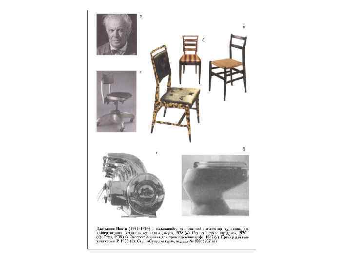 • Формирование «реального» направления в итальянском промышленном дизайне в 1950 -е годы было связано с приходом в него целой группы талантливых архитекторов. Одна из наиболее ярких личностей тех лет Дж. Понти. • Джованни Понти (1891 -1979), выдающийся итальянский архитектор, художник, дизайнер, педагог, создатель известного журнала «Домус» (Domus) в 1928 году, главный редактор этого журнала практически до конца жизни (исключая период 1940 -х). В 1925 году получил Гран-при на Парижской выставке «Ар-деко» . Активно работал как архитектор, дизайнер серийных предметов для интерьеров (мебель и пр. ). Он проектировал изделия индустриального дизайна, в том числе корабельное оборудование и даже большие комплексы. В то же время любил создавать эксклюзивные вещи высокого вкуса. Роль Джованни Понти в итальянском и мировом дизайне, его популярность в широких кругах были столь велики, что в специальной литературе его именовали коротко Джо, а друзья и близкие называли его Неистовым Джо. Идеи Дж. Понти показательная иллюстрация того, что индивидуализация концепций дизайна со временем углубляется. Настрой его убеждений – художественный и, более того, антитехницистский: «У нашего времени нет стиля, нет исторически закрепленного языка формы. Мы оторвемся от стиля, используя огромную свободу экспрессии; технология в своем непрерывном прогрессе, отрицая стабильность, делает возможным все» .