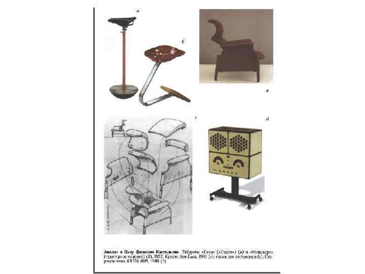 Концептуальные направления • В 1957 году на выставке «Цвет и форма» (вилла Ольмо, Комо) был показан оригинальный, ни на что не похожий «дизайн Кастильони» , позднее охарактеризованный как «концептуально-прикладное искусство» . Младшие братья Кастильони создали интерьер-коллаж жилой комнаты, где соседствовали как традиционные изделия ремесленников, так и изделия промышленного производства (плетеная корзина, чугунная раковина-мойка, настенный черный телефон и пр. ) с их собственными, специально спроектированными для выставки вещами. В числе этих вещей были: подвесной телевизор, который можно было опускать и поднимать к самому потолку; легкий стул - редизайн тонетовского стула «Модель 14» ; низкий стол со сменяемыми столешницами; кресло из губчатой резины «Кубо» , принимавшее форму тела сидящего. Наконец, там были ставшие впоследствии легендарными две модели табуретов: табурет для телефона «Селла» ( «Седло» ) - фантастическая конструкция из седла гоночного велосипеда, насаженного на раздвижную металлическую трубчатую конструкцию красного цвета, вставленную, в свою очередь, в полусферическое чугунное основание (эффект «неваляшки» ), которая предназначалась для того, чтобы «сидеть стоя» или «стоять сидя» , и консольный табурет «Меццадро» , представлявший собой укрепленное на стальной пружинящей рессоре тракторное сиденье. Два последних изделия через пару десятков лет начали изготавливаться серийно фирмой «Дзанотта» (в 1983 и 1971 г. , соответственно). При впечатлении случайности отдельных элементов, экспозиция в целом несла определенную проектную установку. Прежде всего за ней стоял особый тип средо- и формообразования коллажный с сюжетным (а не формально-стилистическим) единством. Не только большинство посетителей выставки, но и коллеги-дизайнеры не поняли и не оценили суть концепции. Говорили о шутке, о причуде «этих сумасшедших Кастильони» .