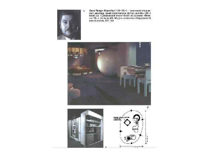 • В 1960 -е годы все большее число дизайнеров-авангардистов начало восставать против элегантной стилистики, выступали за создание целостной предметной среды, а не отдельных объектов. Возникли течения «антидизайна» и «контрдизайна» . Термин «антидизайн» предложил Дж. Ч. Коломбо, который вел футурологические изыскания и создал концептуальные проекты по организации жилой среды. Джоэ (Джованни) Чезаре Коломбо (1930 -1971), известный итальянский дизайнер, окончил Миланскую академию изящных искусств и архитектурный факультет Миланского политехнического института. Первоначально работал как художник, скульптор и архитектор. Его творческое становление происходило в среде художественного авангарда (его брат Джанни - выдающийся представитель абстрактно-кинетического направления в искусстве). Все это в сочетании с приобретенным проектным опытом (с 1962 активно проектировал мебель, оборудование для жилищ и пр. ) позволило Коломбо предлагать авангардные решения динамичного жилого интерьера с ориентацией на активных и ироничных молодых людей. Будущее жилой среды Коломбо видел в радикальном типологическом обновлении ее оборудования и самих пространственно-планировочных принципов на основе как проектного, так и бытового освоения четвертого - временного, динамического - измерения: интеграции смежных функций и потребностей в высокотехнологизированных мобильных многофункциональных блоках-агрегатах ( «островах» ). Эти блоки могли свободно перемещаться по единому пространству интерьера, практически лишенного внутренних стен и перегородок, образуя, в зависимости от потребностей, от ритма жизни, разнообразные, меняющиеся во времени пространственные конфигурации (обитаемая структура, состоящая из серии функциональных блоков, оборудованная жилая ячейка - обитаемый контейнер)