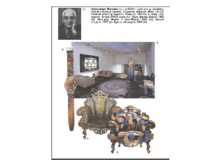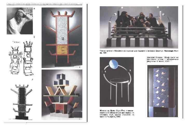 • • В 1976 году архитектор Александре Гурьеро (род. в 1943) создает студию ≪Алхимия≫ - галерею экспериментальных работ, не предназначенных для промышленного производства. На выставке с ироничным названием «Баухаузколлекция» (1979) были показаны объекты, представлявшие собой соединение популярной культуры и радикального кича, в т. ч. новинки «ламинатного стиля» . С начала 1980 -х годов лидером «Алхимии» стал А. Мендини, главный редактор «Домуса» в 1980 -1985 годах. Объектами практической деятельности творческой студии были: архитектура, сценический дизайн, декорирование, одежда, полиграфия, видео, а также проведение семинаров. Дизайнеры стремились превратить изделия повседневного обихода в объекты с эстетическим звучанием, эстетической нагрузкой, не чураясь ни иронии, ни сарказма. В начале 1980 -х годов Этторе Соттсасс образовал коллектив (группу) под названием ≪Мемфис≫. Дебют «Мемфиса» , состоявшийся на Мебельной ярмарке в Милане (1981), стал потрясением для дизайнерского сообщества. Была продемонстрирована мебель из ламинированного пластика ярких цветов с вызывающими геометрическими рисунками, необычной формы, часто в духе кича. Произведения группы разительно контрастировали с «хорошим вкусом» , преобладавшим в дизайне модернизма, вызывая восхищение одних и возмущение других. Философская концепция Э. Соттсасса складывалась в конце 1960 -х годов в условиях развернувшегося в Италии молодежного «движения протеста» против буржуазной системы и ее культуры, неподчинения всем и всяческим авторитетам.