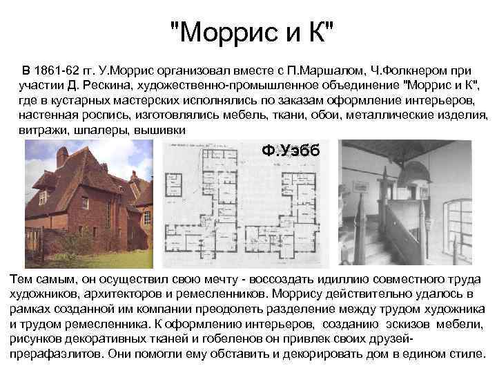 "Моррис и К" В 1861 -62 гг. У. Моррис организовал вместе с П. Маршалом, Ч. Фолкнером при участии Д. Рескина, художественно-промышленное объединение "Моррис и К", где в кустарных мастерских исполнялись по заказам оформление интерьеров, настенная роспись, изготовлялись мебель, ткани, обои, металлические изделия, витражи, шпалеры, вышивки Ф. Уэбб Тем самым, он осуществил свою мечту - воссоздать идиллию совместного труда художников, архитекторов и ремесленников. Моррису действительно удалось в рамках созданной им компании преодолеть разделение между трудом художника и трудом ремесленника. К оформлению интерьеров, созданию эскизов мебели, рисунков декоративных тканей и гобеленов он привлек своих друзейпрерафаэлитов. Они помогли ему обставить и декорировать дом в едином стиле.