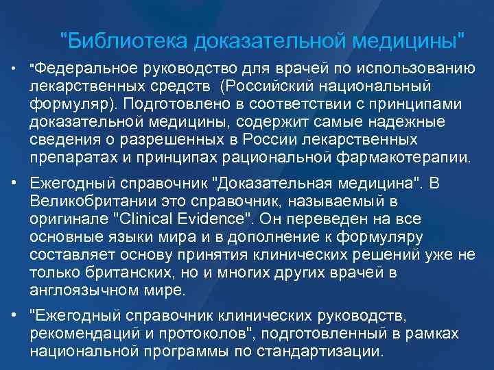 "Библиотека доказательной медицины" • "Федеральное руководство для врачей по использованию лекарственных средств (Российский национальный формуляр). Подготовлено в соответствии с принципами доказательной медицины, содержит самые надежные сведения о разрешенных в России лекарственных препаратах и принципах рациональной фармакотерапии. • Ежегодный справочник "Доказательная медицина". В Великобритании это справочник, называемый в оригинале "Clinical Evidence". Он переведен на все основные языки мира и в дополнение к формуляру составляет основу принятия клинических решений уже не только британских, но и многих других врачей в англоязычном мире. • "Ежегодный справочник клинических руководств, рекомендаций и протоколов", подготовленный в рамках национальной программы по стандартизации.