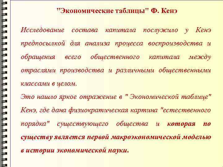 "Экономические таблицы" Ф. Кенэ Исследование состава капитала послужило у Кенэ предпосылкой для анализа процесса воспроизводства и обращения всего общественного капитала между отраслями производства и различными общественными классами в целом. Это нашло яркое отражение в " Экономической таблице" Кенэ, где дана физиократическая картина "естественного порядка" существующего общества и которая по существу является первой макроэкономической моделью в истории экономической науки.