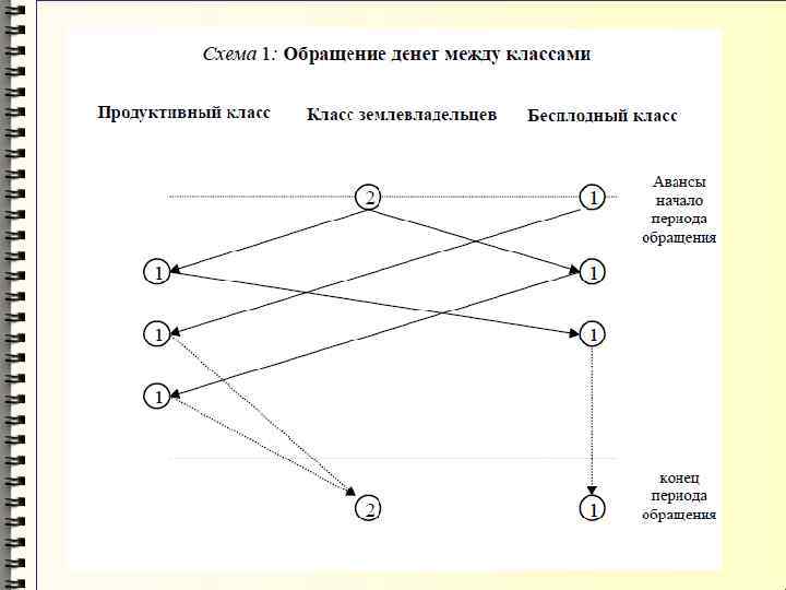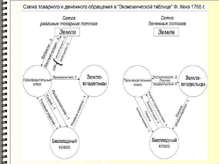 В «Экономической таблице» показано, каким образом богатство, созданное в аграрной сфере, циркулирует между тремя основными классами общества. Круговорот продуктов обеспечивает амортизацию израсходованных средств производства и объединяет три класса в единую хозяйственную систему. Так появилась первая макроэкономическая денежных потоков. известная модель в истории движения товарно-