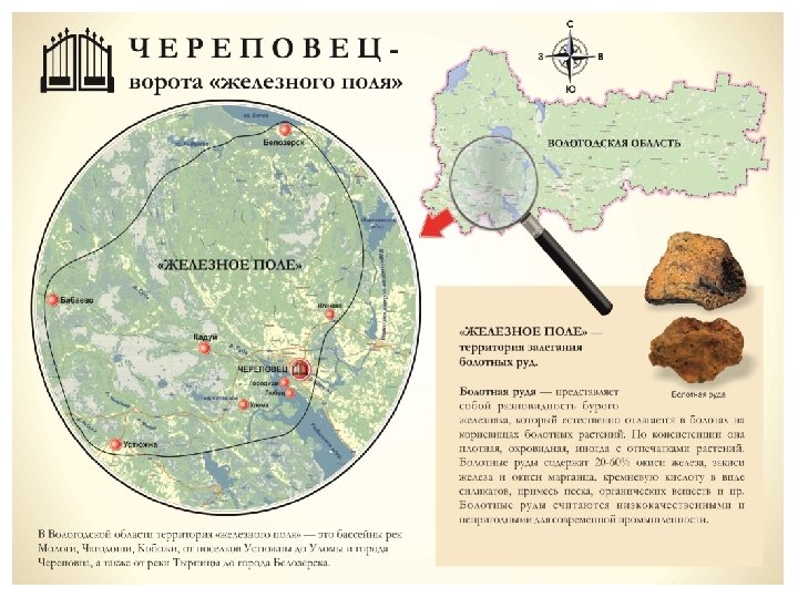 Железное поле • Территория обширного залегания болотных руд, массового производства кустарным, позже – фабричным, способом металлических изделий, традиции работы с металлами, насчитывающие тысячелетия. До конца XVI века железную руду на Руси добывали исключительно из болот и озер. • На Европейском Севере самыми крупными были Устюжско. Белозерский и Карельский районы. Занятия добычей болотных руд, выплавкой и переработкой сыродутного железа в этих районах восходят к глубокой древности. • Железных полей было много. Но лишь одно поле передало свое название ремесленному центру, а затем и городу: сначала - Юстюг Железный, затем - Устюжна Железопольская. В этом названии отразилось то значение, которое имели Устюжна и Железное Поле в Русском государстве в XV - XVII веках. • Территориально это район бассейна р. Мологи с ее притоками - Чагодощей и Кобожей , от города Устюжны до пос. Улома и города Череповца, от реки Тырпецы до Белозерска.