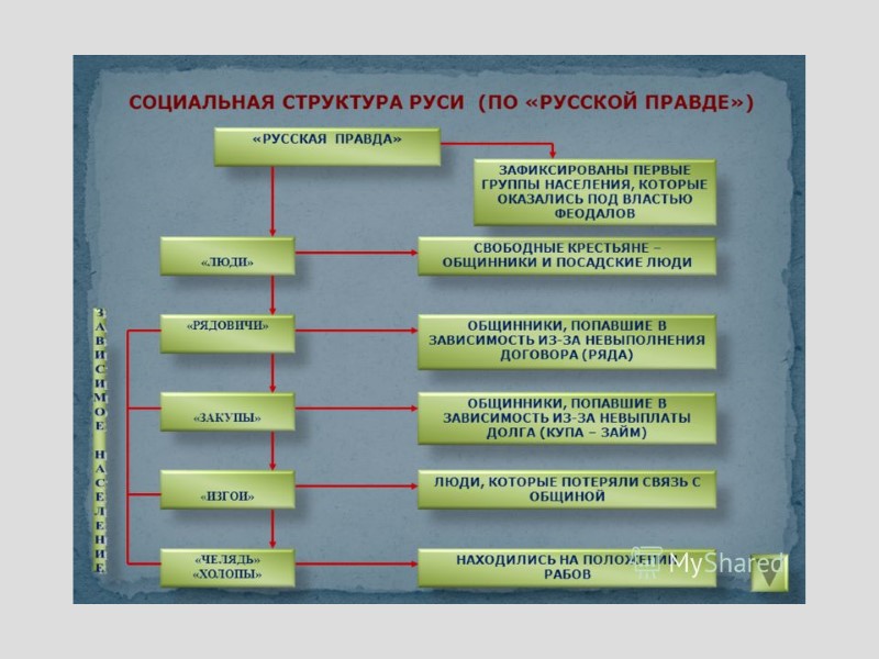 Ярослав Мудрый (1019-1054) – киевский князь, 1036 г. - разгром печенегов, 1043 г. – последний поход против Византии. «Русская правда» – первый свод законов русского права. Лествичная система - обычай княжеского престолонаследия. Все Рюриковичи считались братьями и совладельцами всей страны. Старший в роду сидел в Киеве, следующие по значению в менее крупных городах. По мере смены главного князя все прочие переезжали по старшинству из города в город.