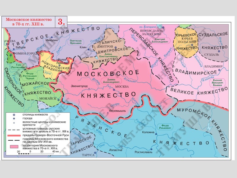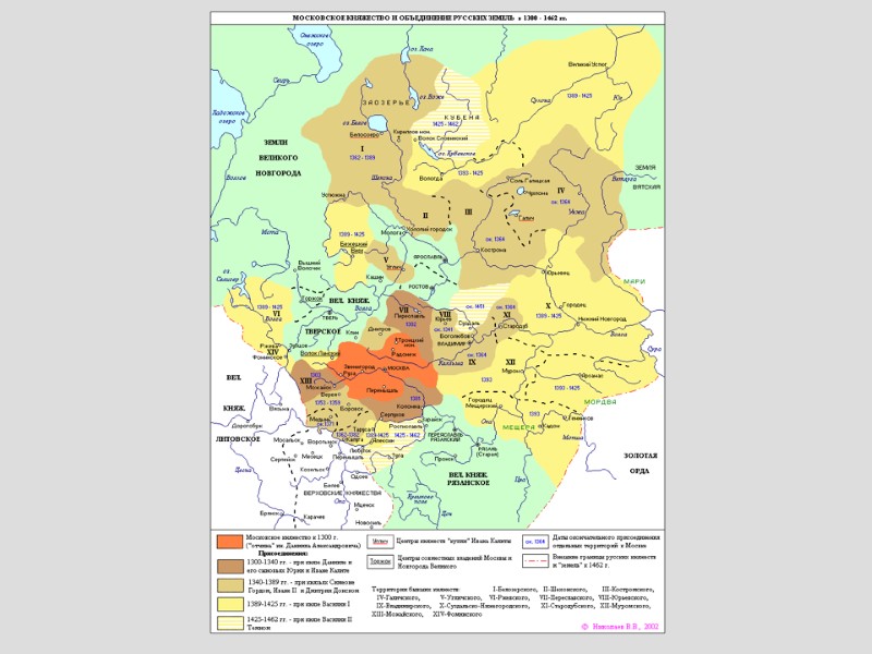 Соперничество Москвы и Твери в XII-XIV вв. 1270-е гг. – возникновение Московского княжества как наследственного владения потомков Александра Ярославовича Невского. Иван Данилович Калита (1325-1340): Перенесение резиденции митрополита Феогноста из Владимира в Москву; Подавление восстания в Твери; Сбор дани для ордынских ханов со всех русских земель; Расширение владений.