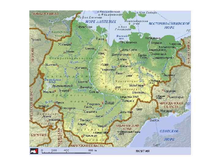 География • Общая площадь территории Якутии составляет 3083, 523 тыс. км²[6]. • Якутия расположена в северо-восточной части Сибири. Граничит на востоке с Чукотским автономным округом, Магаданской областью, на юго-востоке — с Хабаровским краем, на юге — с Амурской областью и Забайкальским краем, на юго-западе — с Иркутской областью, на западе — с Красноярским краем, на севере её естественные рубежи образуют моря Лаптевых и Восточно. Сибирское. Общая протяжённость морской береговой линии превышает 4, 5 тыс. км. • Более 40 % территории Якутии находится за Северным полярным кругом. Протяжённость республики с севера на юг — 2500 км, с запада на восток — 2000 км. Самая западная точка — на границе с Красноярским краем (105° в. д. ), восточная — на границе с Чукотским автономным округом (165° в. д. ), южная — на Становом хребте, на границе с Амурской областью (55° 30' с. ш. ), северная материковая — на мысе Нордвик (74° с. ш. ) и северная островная — на острове Генриетты (77° с. ш. ).