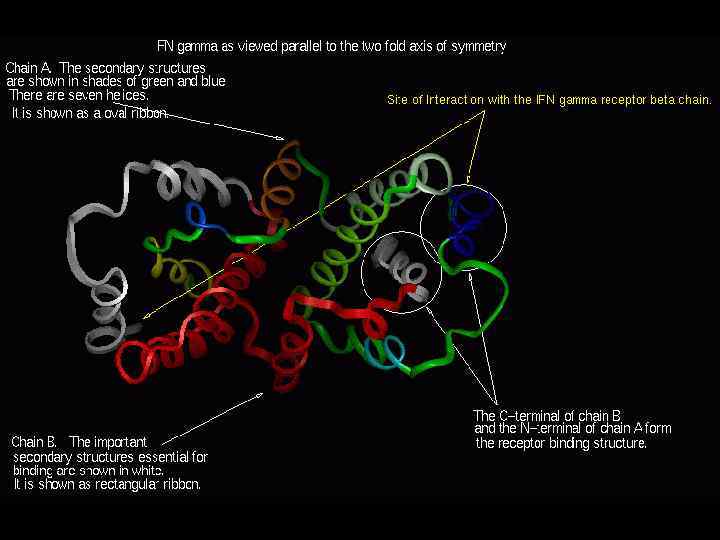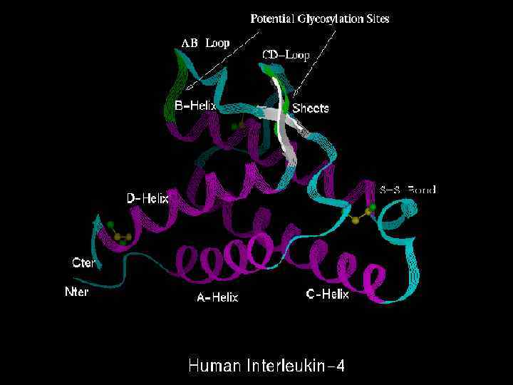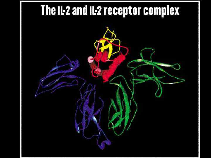Интерлейкин 4 взаимодействует с рецептором интерлейкина 2 Синим цветом представлен ИЛ 4; Зеленым и красным цветом - -цепи рецептора ИЛ 2