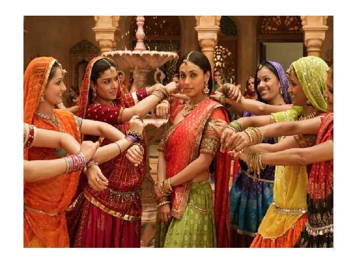 Эстетический идеал красоты. • Прежде всего, нужно отметить, что женской фигуре отводилась более значимая роль, чем лицу. Дело в том, что в индийской религии центр человека, её главная часть - это живот. Недаром индианки привлекают внимание именно к этой части тела в танце и своим нарядом. У женщины должны быть тонкая талия, пышный бюст и округлые бёдра, которые часто сравнивали с бёдрами слона или коровы - священными индийскими животными. Особое внимание уделялось волосам: длинному, шелковистому, цвету вороньего крыла, а также коже - нежной, гладкой и блестящей.