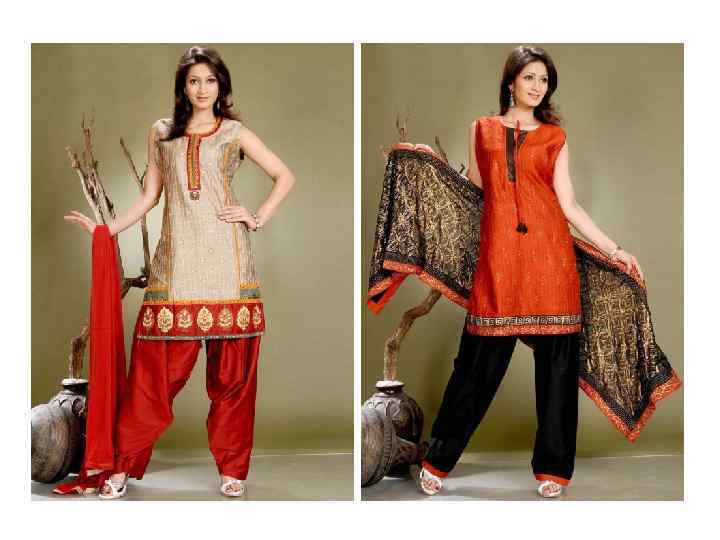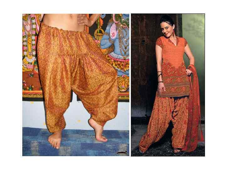 Сальвар (шальвар) - это штаны, и довольно широкие в верхней части, благодаря множеству складок, и зауженные в нижней. Камиз означает длинную тунику, по бокам которой оставляют разрезы, называемые чаак, которые доходят до талии, что очень удобно при ходьбе. Длина камиза, согласно традиционному стилю, должна быть до колен. Разнообразные вырезы украшают орнаментом, зеркалами, блестками и вышивкой. В дополнении к сальвар камизу женщины одевают длинный и широкий шарф, называемый дупатта (dupatta) или чунни (chunni)