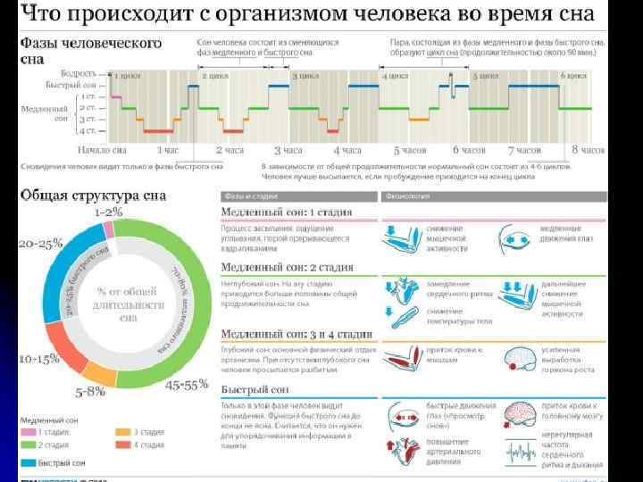 Сон с физиологической точки зрения. В настоящее время ученые определили, что ночной сон состоит из пяти различных фаз, каждая из которых характеризуется своими отличительными признаками и выполняет свои функции. В процессе сна эти фазы последовательно сменяют друга, и наше здоровье и душевное равновесие зависят от полноты и завершенности всего цикла сна.
