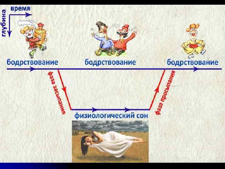 Функции сна l l l Сон обеспечивает отдых организма. Cпособствует переработке и хранению информации. Сон (особенно медленный) облегчает закрепление изученного материала, быстрый сон реализует подсознательные модели ожидаемых событий. Сон — это приспособление организма к изменению освещённости (день-ночь). Сон восстанавливает иммунитет путём активизации T -лимфоцитов, борющимися с простудными и вирусными заболеваниями