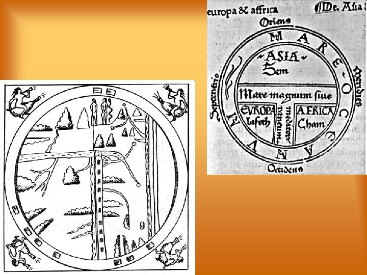 Эпоха Средневековья • В раннем Средневековье картография пришла в упадок. Вопрос о форме Земли перестал быть важным для философии того времени, многие снова начали считать Землю плоской. Получили распространение так называемые Т и О карты, на которых поверхность Земли изображалась состоящей из дискообразной суши, окружённой океаном (буква О). Суша изображалась разделённой на три части Европу, Азию и Африку. Европу от Африки отделяло Средиземное море (нижняя часть буквы Т), Африку от Азии река Нил (правая часть перекладины Т), а Европу от Азии река Дон (Tanais) (левая часть перекладины Т).