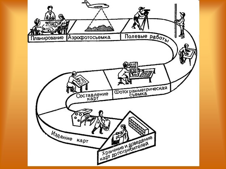• Практическое значение картографии определяется ценностью и незаменимостью географических карт как наглядных и точных пространственных моделей, широко используемых в народнохозяйственных, культурно-образовательных и оборонных целях. • В картографическом производстве карты получают либо в результате полевых съёмок и обработки их материалов, либо в камеральных, т. е. в кабинетных или лабораторных, условиях путём использования и переработки разнообразных источников - картографических, географических, экономикостатистических и др.