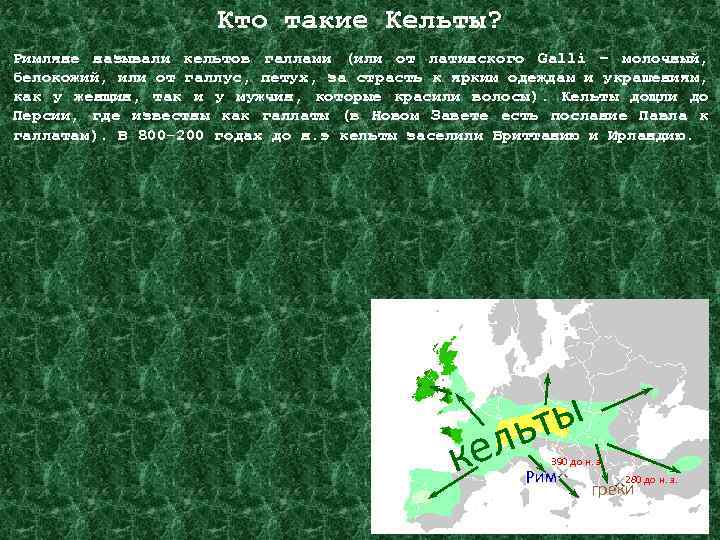 Кто такие Кельты? Римляне называли кельтов галлами (или от латинского Galli – молочный, белокожий, или от галлус, петух, за страсть к ярким одеждам и украшениям, как у женщин, так и у мужчин, которые красили волосы). Кельты дощли до Персии, где известны как галлаты (в Новом Завете есть послание Павла к галлатам). В 800 -200 годах до н. э кельты заселили Бриттанию и Ирландию. ты ль ке 390 до н. э. Рим 280 до н. э. греки