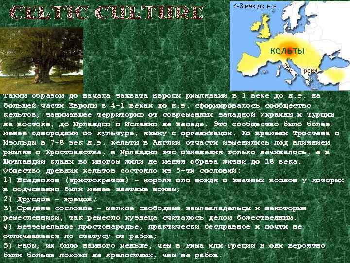 4 -3 век до н. э. кельты Ри м греки Таким образом до начала захвата Европы римлянами в 1 веке до н. э. на большей части Европы в 4 -1 веках до н. э. сформировалось сообщество кельтов, занимавшее территорию от современных западной Украины и Турции на востоке, до Ирландии и Испании на западе. Это сообщество было болееменее однородным по культуре, языку и организации. Ко времени Тристана и Изольды в 7 -8 век н. э. кельты в Англии отчасти изменились под влиянием римлян и Христианства, в Ирландии эти изменения только начинались, а в Шотландии кланы во многом жили не меняя образа жизни до 18 века. Общество древних кельтов состояло из 5 -ти сословий: 1) Всадников (аристократов) – короля или вождя и знатных воинов у которых в подчинении были менее знатные воины; 2) Друидов – жрецов; 3) Среднее сословие – мелкие свободные землевладельцы и некоторые ремесленники, так ремесло кузнеца считалось делом божественным. 4) Безземельное простонародье, практически бесправное и почти не отличавшееся по статусу от рабов; 5) Рабы, их было намного меньше, чем в Рима или Греции и они вероятно были больше похожи на крепостных, чем на рабов.